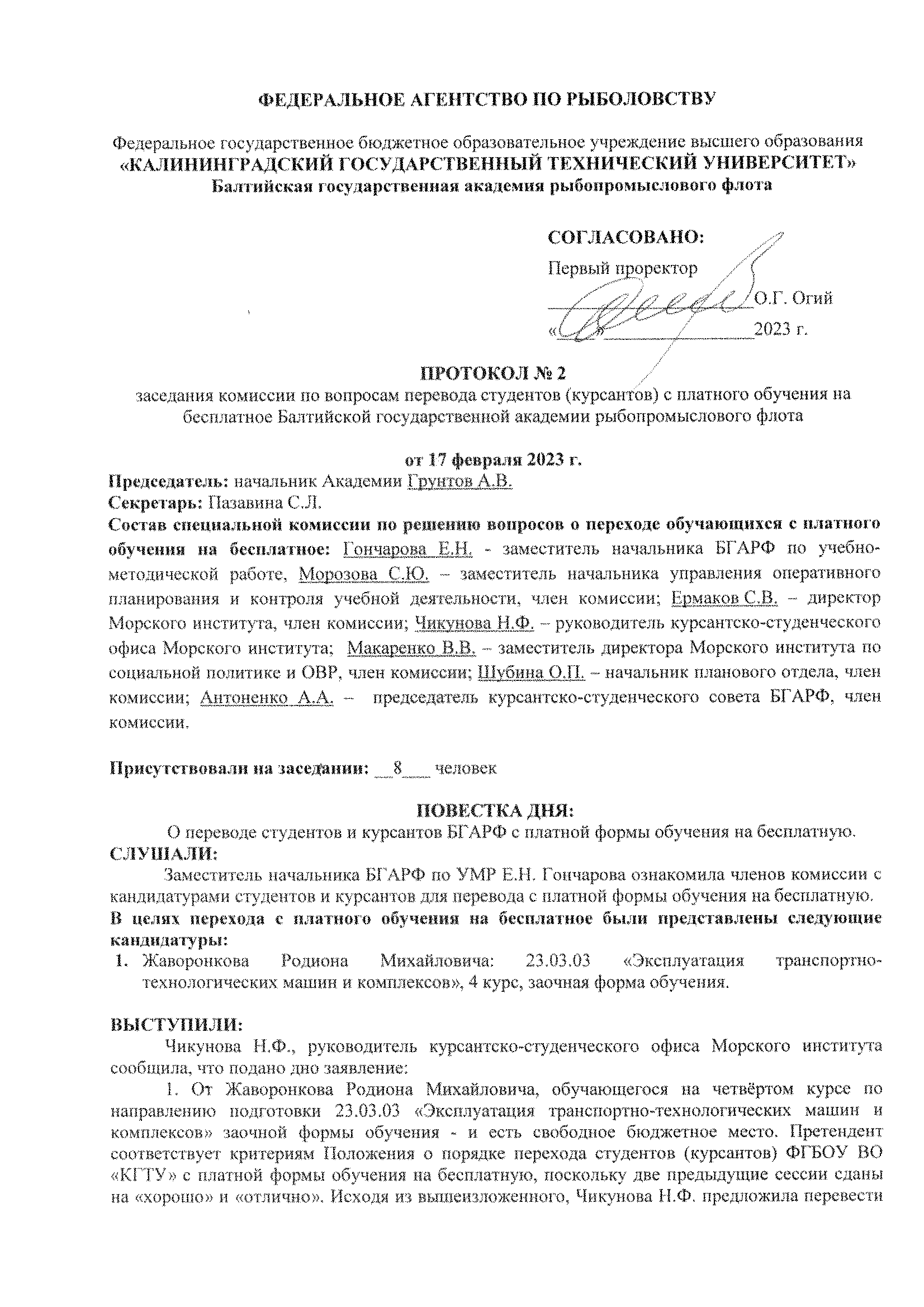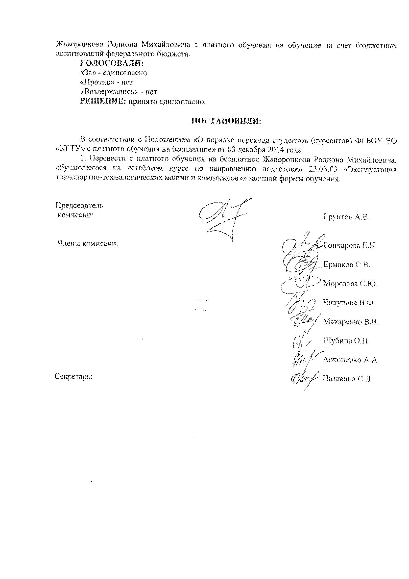 Комиссия единогласно постановила перевести с платной формы на бюджетную форму обучения студента 4 курса заочной формы обучения по направлению подготовки 23.03.03 «Эксплуатация транспортно-технологических машин и комплексов» Жаворонкова Родиона Михайловича как соответствующего всем критериям «Положения о порядке перевода».